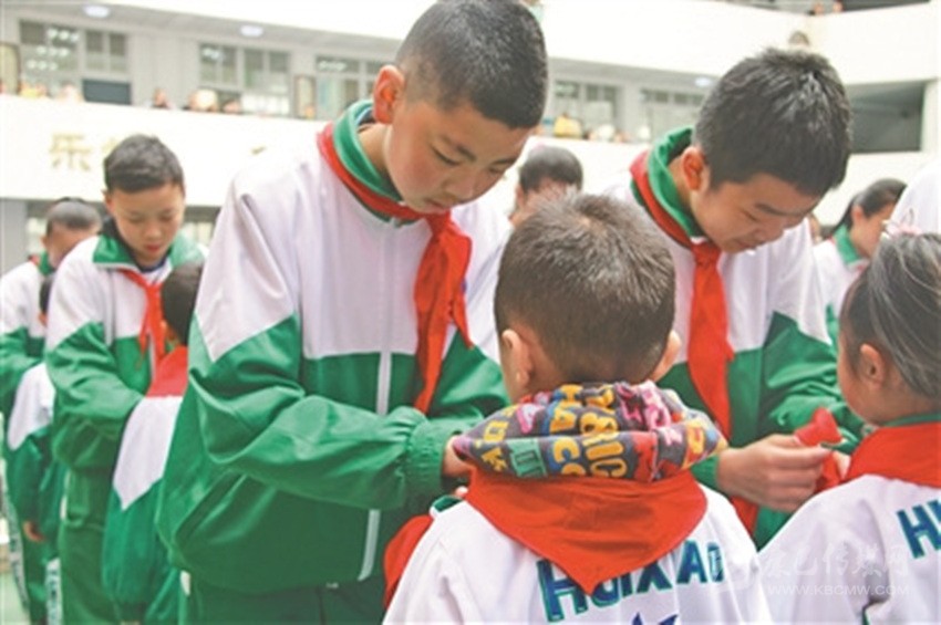 康定市回民小學六年級學生為新入隊學生佩戴紅領(lǐng)巾。