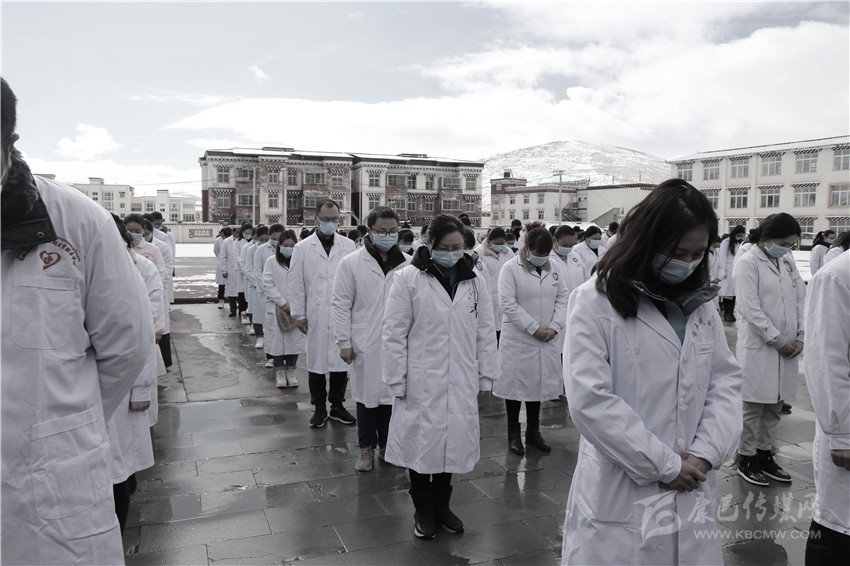 色達(dá)縣醫(yī)務(wù)工作者向新冠肺炎疫情犧牲烈士和逝世同胞默哀。