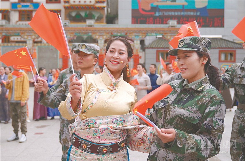 美妙的歌聲縈繞四方,鮮艷的旗幟迎風飄揚。就在眾人忘情高歌之時,來自州歌舞團的50多名演員將一面巨大的印有“建州70年Logo”的紅旗,在廣場正中鋪展開來。以這面旗幟為中心,先后到來的人們組成了三個同心圓,用歌聲禮贊甘孜州建州70周年。