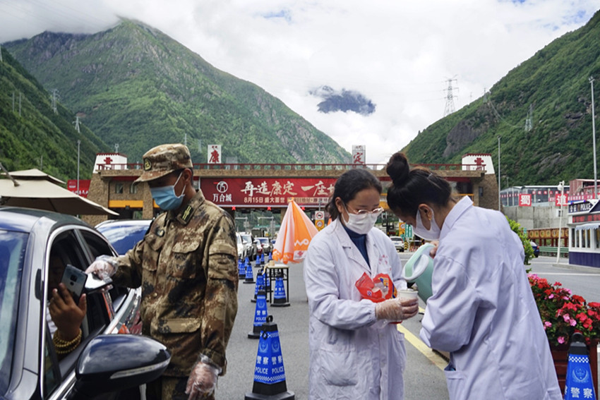 地震又遇疫情。大量救援隊進入災(zāi)區(qū),加大了當(dāng)?shù)匾咔榉揽氐膲毫?。為減輕當(dāng)?shù)胤酪邏毫Γ?月6日,州藏醫(yī)院再次抽派8名醫(yī)務(wù)人員組成兩支核酸采樣隊,奔赴瀘定縣得妥鎮(zhèn)火線支援疫情防控工作。核酸采樣隊到達(dá)目的地后,在應(yīng)急指揮部的安排下,迅速投入到了緊張有序的采樣工作中。截止撤離時,共為當(dāng)?shù)亻_展了1萬余人次的核酸采樣。