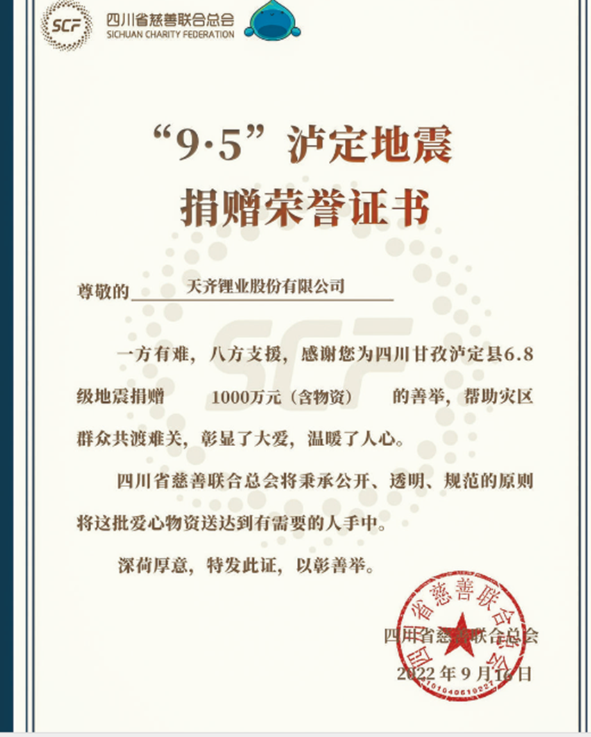 天齊鋰業(yè)“9·5”瀘定地震捐贈(zèng)證書。