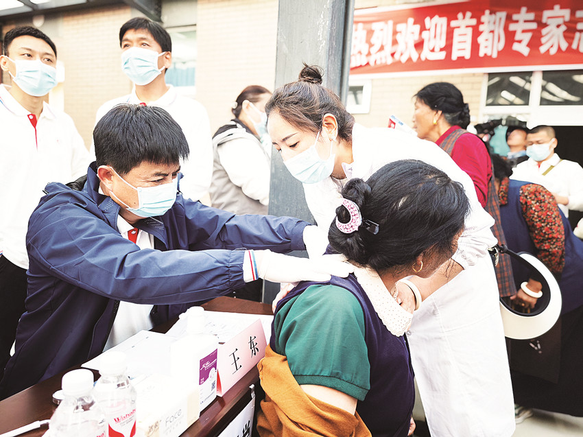 排隊(duì)、分診、診斷……在巴塘縣義診現(xiàn)場(chǎng),每一位身著白衣、口音輕柔的醫(yī)生面前都有數(shù)名等待問(wèn)診的群眾。來(lái)自北京大學(xué)第一醫(yī)院、解放軍第八醫(yī)學(xué)中心、北京航天總醫(yī)院等醫(yī)療機(jī)構(gòu),涵蓋腎臟、中醫(yī)、骨科、肝病科疾病等多個(gè)領(lǐng)域的專(zhuān)家團(tuán)隊(duì)正為前來(lái)問(wèn)診的群眾提供多學(xué)科專(zhuān)業(yè)義診服務(wù),并就常見(jiàn)疾病耐心細(xì)致地為患者及家屬答疑解惑。