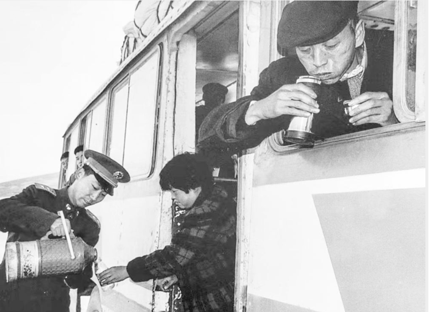 筆者看到在不遠(yuǎn)處的展板上,幾張老照片訴說(shuō)著茶水站的歷史:20世紀(jì)90年代初的川藏線上,人煙稀少,路過(guò)的司機(jī)不僅吃不上熱飯,有時(shí)連口熱水都喝不上。為此,該雷達(dá)站時(shí)任指導(dǎo)員劉寶森帶領(lǐng)官兵搭起簡(jiǎn)易小木棚。有車輛經(jīng)過(guò)時(shí),值班官兵就高高舉起暖瓶,示意司機(jī)停車喝水。