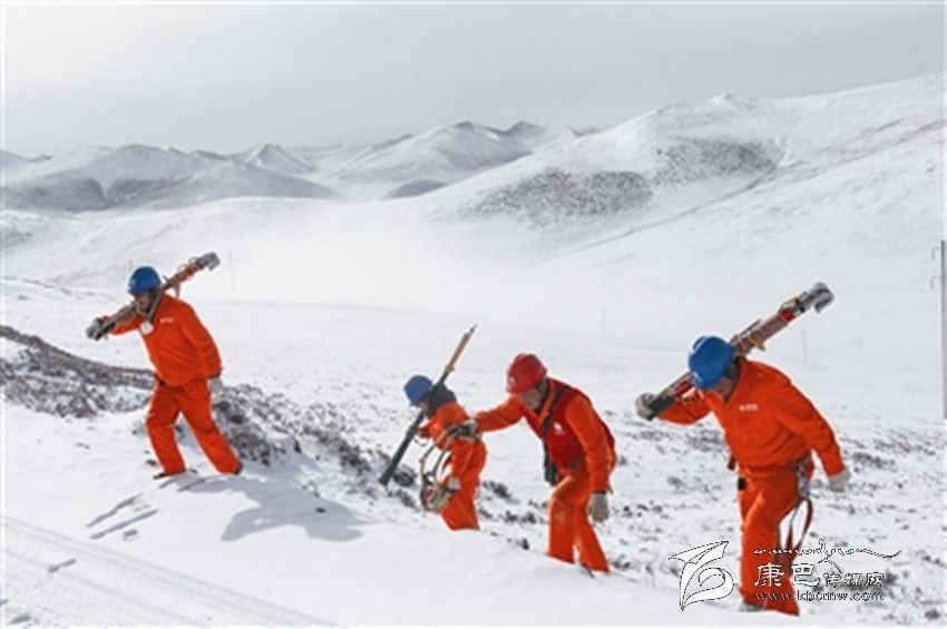 石渠電力員工行走在海拔4200米的風雪巡線路上。