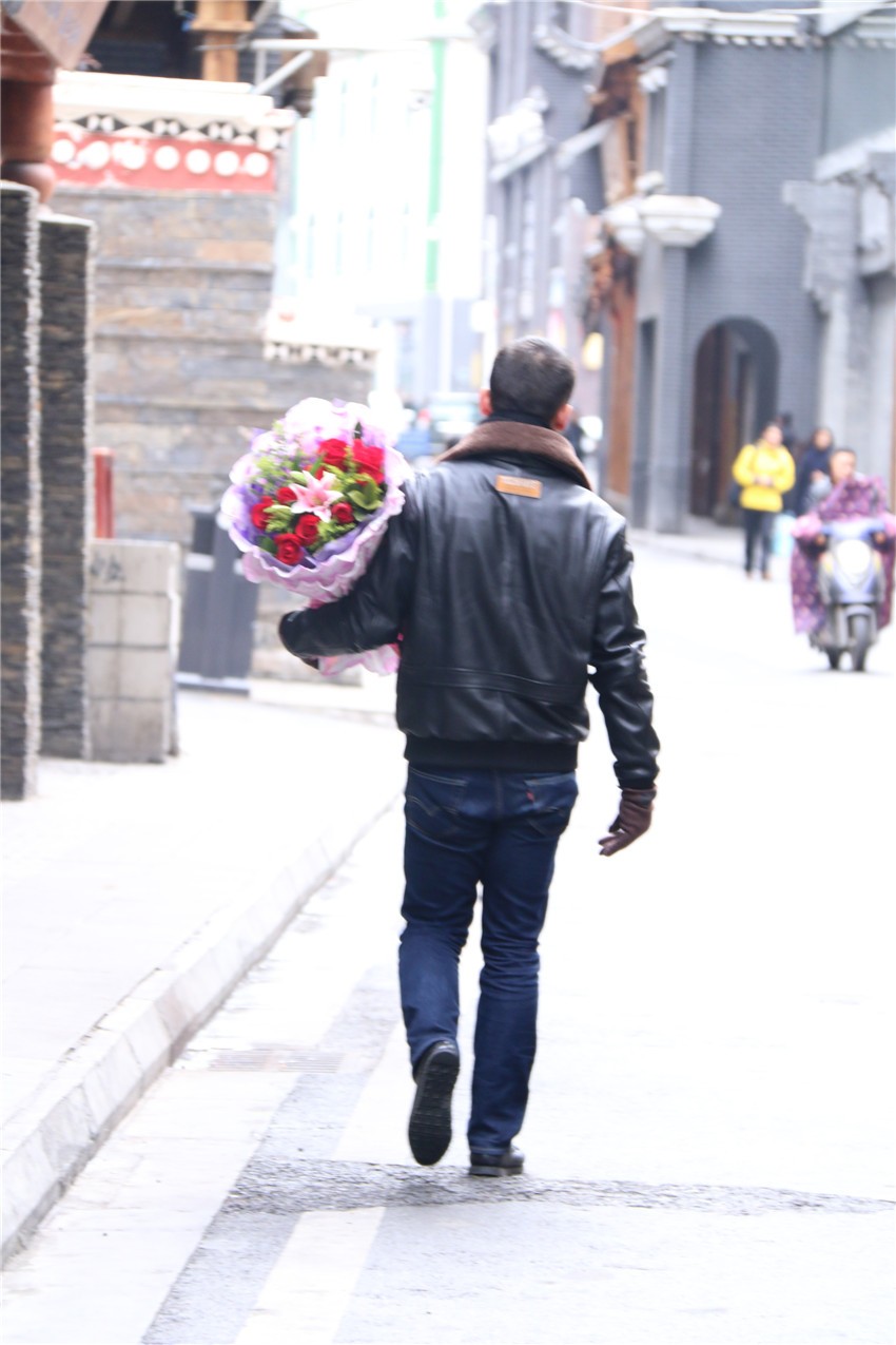 愛神阿佛洛狄特為了追尋情人阿多尼斯,在玫瑰花叢中奔跑,被花刺刺傷,白色的玫瑰花因其血液浸染從此變成紅色的故事,玫瑰便成了愛情的象征和傳情的首選信物。現(xiàn)在,用一束精心挑選的玫瑰向心愛的那個她表達濃烈、深沉的情意已是康定人過情人節(jié)的重要元素。微風(fēng)中、花店里,那一束束繽紛燦爛的玫瑰,不僅承載著花店老板的經(jīng)濟收入,更承載著眾多男女的愛情收獲,儼然是最鮮明的節(jié)日符號。而玫瑰花必不可少的“搭檔”便是一張泣血陳“情”的賀卡,而寫賀卡最佳姿勢恐怕應(yīng)該是單膝跪地。