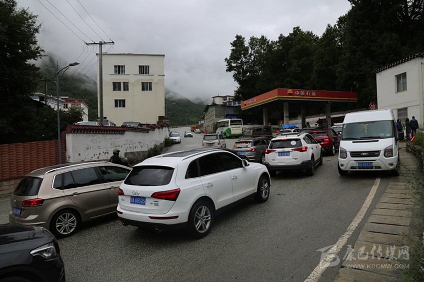 8月7日上午9時(shí)10分,中石油康定市折多山加油站,左側(cè)加油進(jìn)車口排起了長(zhǎng)龍,記者目測(cè),在加油站進(jìn)口處,等待加油的車輛已排成三排,約有六七十米遠(yuǎn),當(dāng)時(shí)等待加油的車輛有43輛。排隊(duì)車輛占據(jù)了國(guó)道318線此路段一半路面,從折多山方向駛來(lái)的車輛很多,有部分車輛沒(méi)料到此路段有車輛占道,急忙放緩車速。