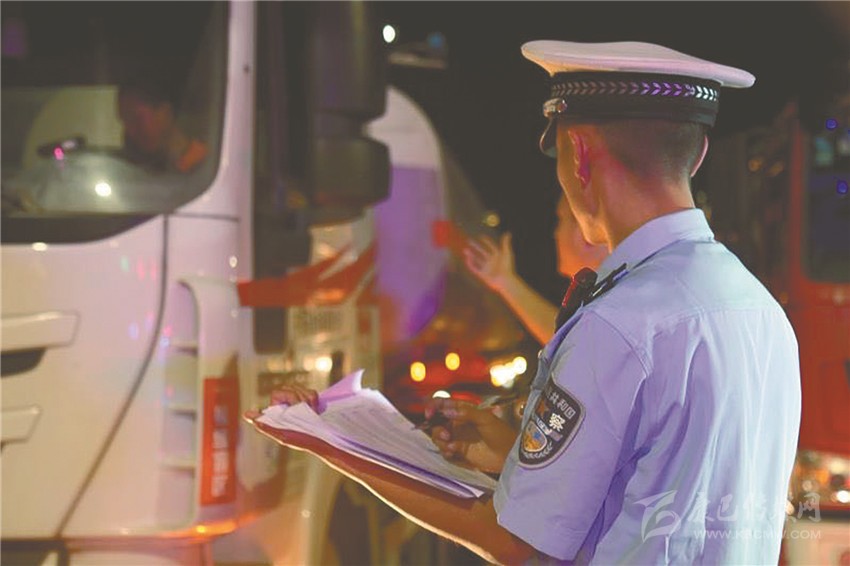 圖為交警現(xiàn)場(chǎng)核查車輛信息。