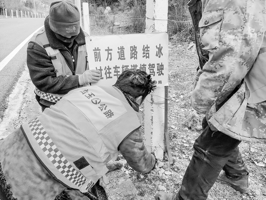 冬季氣溫下降,在夜晚形成結(jié)冰現(xiàn)象,易造成汽車打滑,難以控制,對過往車輛安全造成極大威脅。白玉公路分局出動人員 450 人、 車輛72輛次,對管養(yǎng)轄區(qū)道路全線進(jìn)行警示牌的安裝。同時,對有暗冰、陰山積雪等路段及時拋灑防滑沙和融雪劑,確保道路行駛安全。