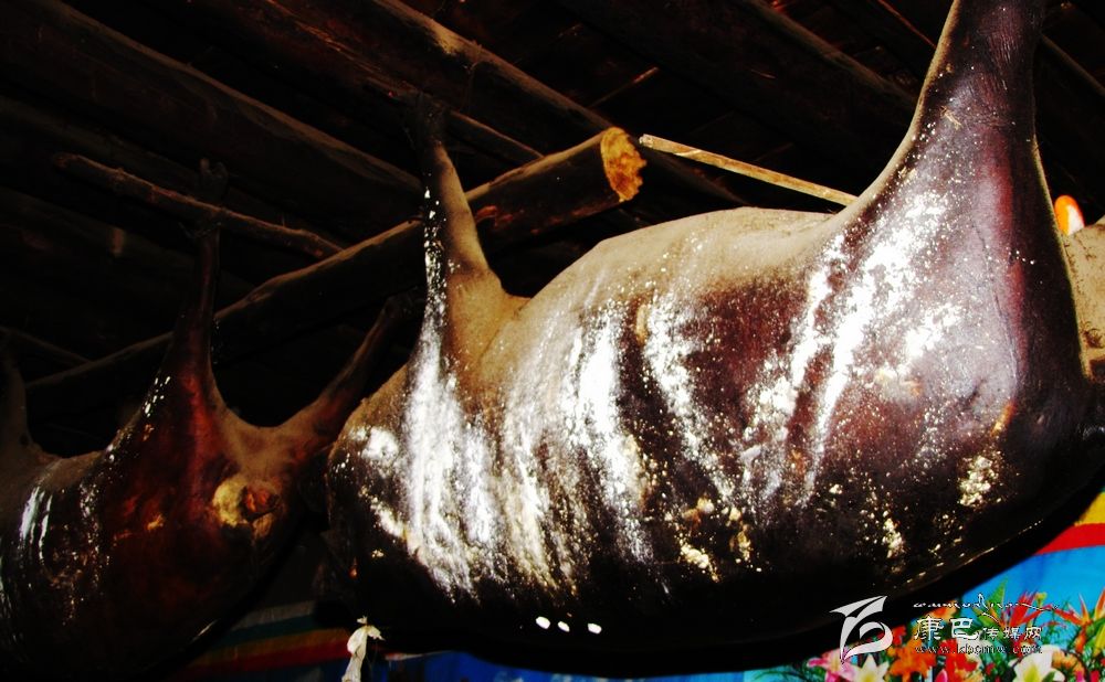 臭豬肉用扎壩語準(zhǔn)確翻譯應(yīng)譯“陳豬肉”或“舊豬肉”。由于其惡味乍聞重于“臭豆腐”,濃于廣東的“酶香咸魚”,所以稱“臭豬肉”。但扎壩人卻視之為上品,極其愛吃,并作為居家待客的最高珍品,家家戶戶都要熏制存放,且越存放得久越被視為珍貴,因此,在扎壩地區(qū),家中懸掛多少“臭豬肉 ”和懸掛的年限多少也自然成為當(dāng)?shù)睾饬控毟坏南笳鳌?br />     “臭豬肉”的制作過程和來歷:豬用玉米和麥子喂肥后,用繩索套豬頸勒死,在其胸開一小口將豬心血脈弄斷,使肉中的血全部流回到內(nèi)臟中,再把所有的內(nèi)臟從小口中取出,并填上青稞、麥子等谷物后縫合,再用灶灰和紅土塞住七竅,把氣吹脹,埋在麥糠中10余天吸干水,取出掛在灶上的房梁上自然煙熏數(shù)年即成。其懸掛年限可達(dá)10年以上,最長的可達(dá)30余年。食用時,隨用隨取,做法也很多,可生吃,可煮食,也可熬湯。扎壩人多愛生吃,初嘗入口難適,多食后方覺滿口濃香,回味無窮。過去是為防備戰(zhàn)事而儲備食品,后來就逐漸成為當(dāng)?shù)氐囊环N飲食習(xí)俗和主要食品了。