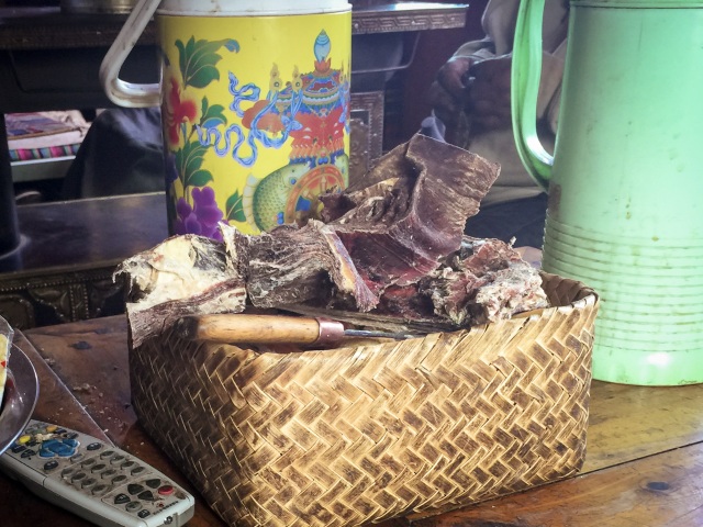 第二種吃法是,風(fēng)干坨坨肉,通常是帶骨的風(fēng)干肉,需要用藏刀割著吃,這也是最傳統(tǒng)的游牧藏族食肉方式。