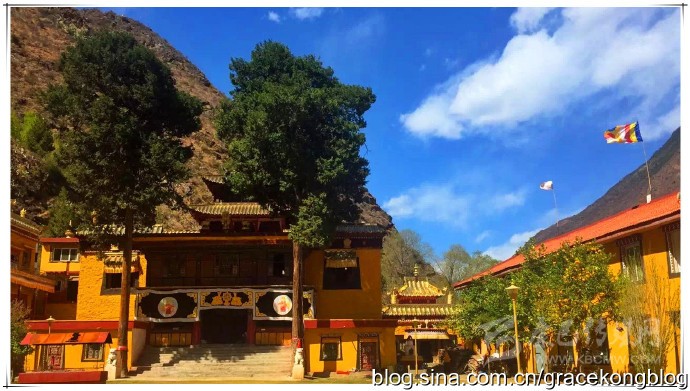 該寺廟為四合院布局,坐北朝南,原占地面積2700㎡,為藏漢結(jié)合建筑,由大殿、藏經(jīng)樓、僧舍組成。大殿為藏式石木結(jié)構(gòu),有二十四根雕龍木柱,殿分二層,供有釋迦牟尼、宗喀巴、未來佛、千手觀音、南海觀音等神像,殿側(cè)藏經(jīng)樓藏經(jīng)書上千卷。殿堂富麗堂皇,壁畫五彩斑斕,閣樓古樸美觀,雕梁畫棟,分外精巧;廟四周古柏參天蔽日,綠草如茵,風景格外迷人。